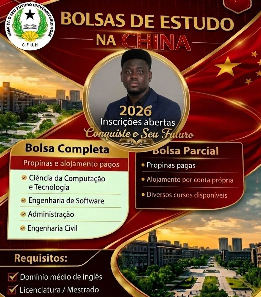 A CFUH abre as portas do mundo para a juventude guineense! Estão abertas as inscrições para o programa de Bolsas de Estudo na China 2026, oferecendo percursos académicos de excelência em instituições de renome.